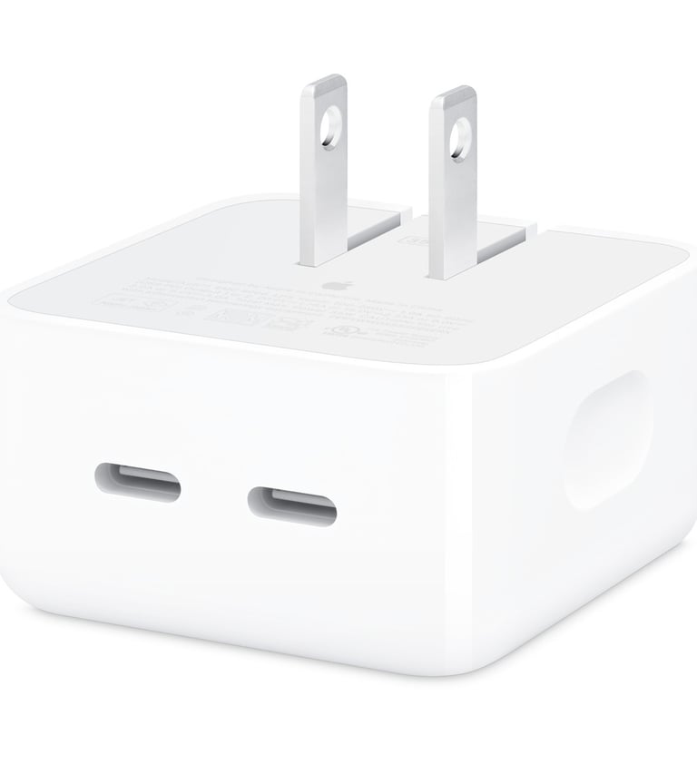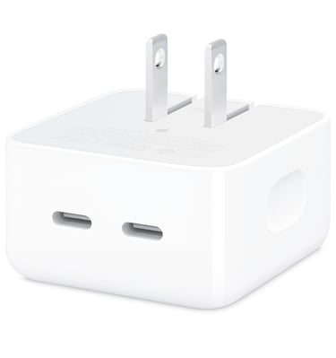 El adaptador de corriente compacto de 50 W con dos puertos USB-C te permite cargar dos dispositivos al mismo tiempo dondequiera que estés